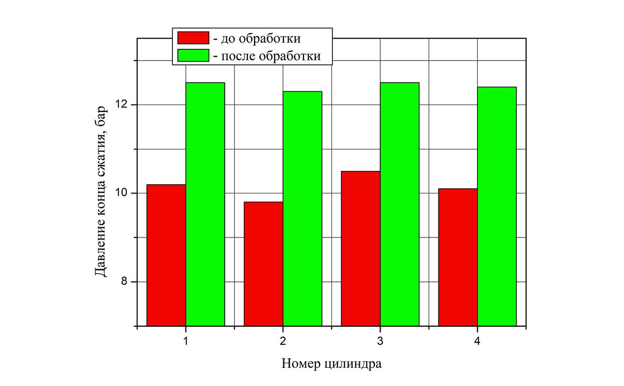 Результаты замеров компрессии по цилиндрам до и после обработки двигателя МПТ
